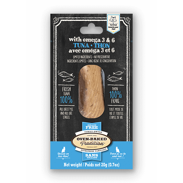 Canadian Brand. Oven-Baked Tradition Grilled Tuna with Omega 3 & 6 Fillets for cats are grain-free and prepared with fresh tuna. These fresh & authentic fillets have a limited number of ingredients - perfect for cats with food sensitivities. With only 17 calories, they're low in fat and contain no trans-fat for better health. The perfect reward!