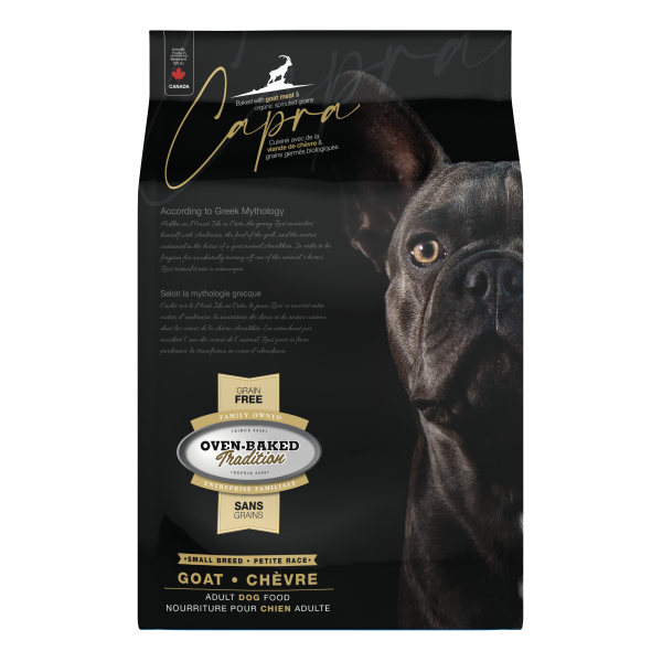 Canadian Brand. Oven-Baked Tradition Capra is an all-natural dog food prepared with goat meat. Formulated for small breed adult dogs, this recipe is grain-free and provides an excellent source of highly digestible and lean protein compared to other meats. Deboned goat is a great alternative source of protein for dogs with intolerance to chicken proteins. Pumpkin is rich in beta-carotene and vitamins A, C, and E. Cranberries are a source of antioxidants to help control urinary tract infections while green tea extract helps prevent dental plaque.