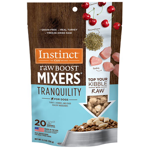 Instinct Raw Boost Freeze-Dried Mixers Tranquility Support is made with cage-free turkey plus vibrant, functional ingredients like valerian root, passionflower, and tryptophan to support a calm demeanor and help reduce stress. Raw, whole-food ingredients are freeze-dried to gently remove the moisture, while locking in nutrients and flavour. Raw Boost Freeze-Dried Mixers are made without grain, corn, wheat, soy, white potato, artificial flavours or preservatives. Made in the USA with the finest ingredient from around the world!