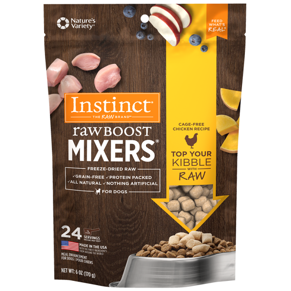 Top your dog's kibble with raw. Instinct Raw Boost Mixers Cage-Free Chicken Recipe is the easiest way to put more of the pure, real nutrition of raw into every bowl. Made with protein-packed, cage-free chicken and chicken liver plus non-GMO vegetables & fruits - Raw Boost Mixers support proper digestion, healthy skin & coat, energy and vitality. They provide all-natural, minimally processed nutrition without grain, potato, corn, wheat, soy, by-product meal, artificial colors or preservatives.
