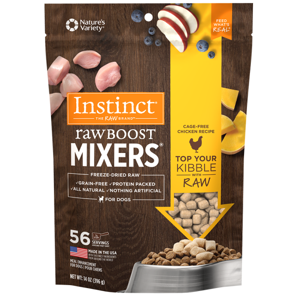 Top your dog's kibble with raw. Instinct Raw Boost Mixers Cage-Free Chicken Recipe is the easiest way to put more of the pure, real nutrition of raw into every bowl. Made with protein-packed, cage-free chicken and chicken liver plus non-GMO vegetables & fruits - Raw Boost Mixers support proper digestion, healthy skin & coat, energy and vitality. They provide all-natural, minimally processed nutrition without grain, potato, corn, wheat, soy, by-product meal, artificial colors or preservatives.