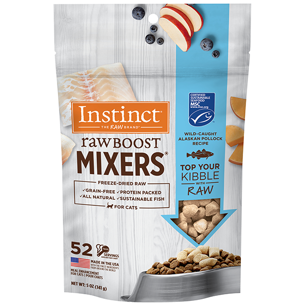Top your cat's kibble with raw. Instinct Raw Boost Mixers Wild-Caught Alaskan Pollock Recipe is the easiest way to put more of the pure, real nutrition of raw into every bowl. Made with 10-ounces of MSC-Certified, Wild-Caught Alaskan Pollock plus non-GMO vegetables & fruits. Raw, whole-food ingredients are freeze-dried to gently remove the moisture, while locking in nutrients and flavor. Supports proper digestion, healthy skin & coat, energy, and vitality.