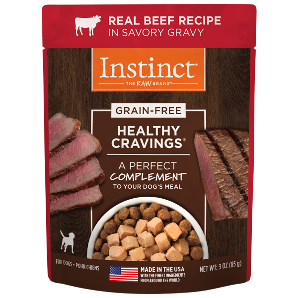 Add the taste and variety your dog craves with Instinct Healthy Cravings Grain-Free Real Beef Recipe - the perfect complement to your dog's meal. With cuts of grass-fed beef in a savory gravy, it's made without grain, potato, corn, wheat, soy, by-product meal, artificial colors or preservatives. Use as a topper or mixer to add the delicious taste and moisture your dog craves.