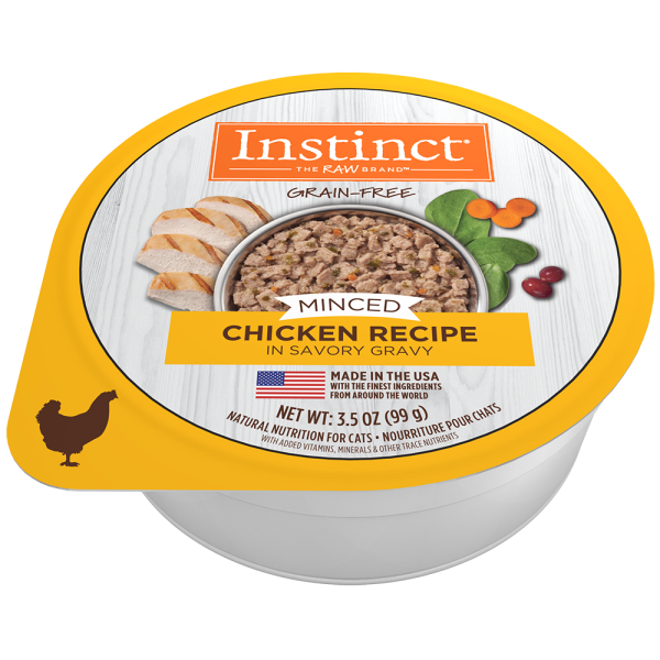 Instinct Grain-Free Minced Chicken Recipe unlocks your cat's potential to thrive. Made with cuts of cage-free chicken in a savory gravy, Instinct Minced Cups contain whole-food ingredients you can see - like carrots, spinach and cranberries. This recipe has a delicious minced texture and is made without grain, potato, corn, wheat, soy, by-product meal, artificial colors or preservatives.