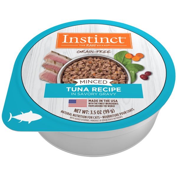 Instinct Grain-Free Minced Tuna Recipe unlocks your cat's potential to thrive. Made with cuts of wild-caught tuna in a savory gravy, Instinct Minced Cups contain whole-food ingredients you can see - like carrots, spinach and cranberries. This recipe has a delicious minced texture and is made without grain, potato, corn, wheat, soy, by-product meal, artificial colors or preservatives.