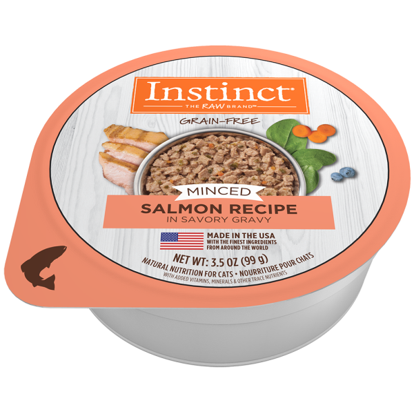 Instinct Grain-Free Minced Salmon Recipe unlocks your cat's potential to thrive. Made with cuts of wild-caught salmon in a savory gravy, Instinct Minced Cups contain whole-food ingredients you can see - like carrots, spinach and cranberries. This recipe has a delicious minced texture and is made without grain, potato, corn, wheat, soy, by-product meal, artificial colors or preservatives.