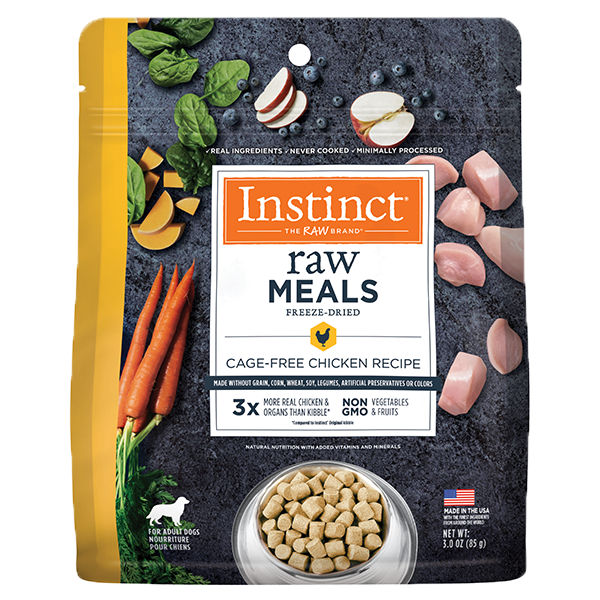 Upgrade your dog's bowl from kibble to freeze-dried raw. Each Instinct Raw Freeze-Dried Meals recipe is protein packed with 85% meat & organs and 15% non-GMO fruits, vegetables, vitamins & minerals. Made without grain, corn, wheat, soy, legumes, artificial colors or preservatives. Raw foods are never cooked, preserving the integrity of the ingredients and their nutrients, for 100% complete & balanced meals. Feeding raw supports healthy digestion, lean muscles, strong bones, vibrant skin & coat, and overall energy and vitality. Made in the USA with the finest ingredients from around the world.