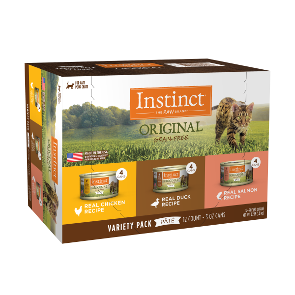 The Instinct Original Can Variety Pack contains 12 - 3oz cans, 4 each of Chicken, Duck and Salmon. These high animal protein, grain-free recipes will unlock your cat's potential to thrive. Each recipe starts with cage-free chicken, duck or wild-caught salmon. Each recipe is packed with animal protein for strong, lean muscles. With a delicious paté textur,e they are made in the USA with the finest ingredients from around the world. They are made without grain, corn, wheat, soy, potato, artificial flavors or preservatives.