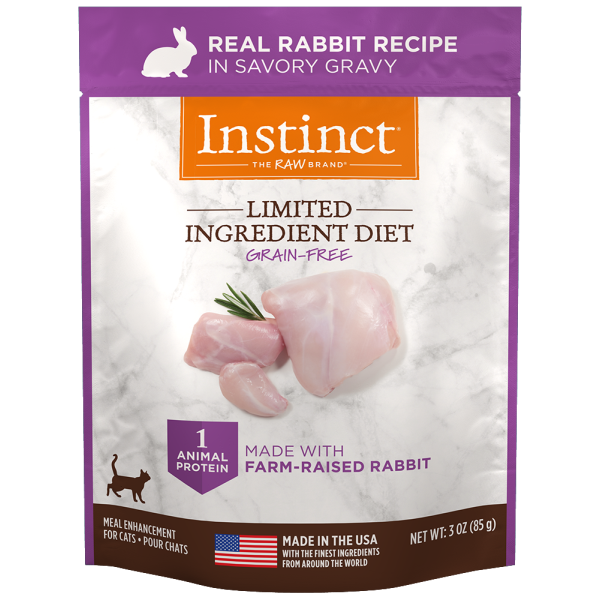 Made with one animal protein and one vegetable, Instinct Limited Ingredient Diet Grain-Free Real Rabbit Recipe for cats is a simple complement, perfect for any meal. Delicious cuts of farm-raised rabbit in savory gravy come in an easy to serve package. Instinct is made in the USA with the finest ingredients from around the world. They are made without grain, corn, wheat, soy, dairy, eggs, chicken, beef, fish, sweet potato, potato, carrageenan, artificial colors or preservatives. Instinct LID is a purposefully simple complement for any meal, perfect for pets with food sensitivities.