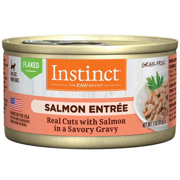 Instinct Salmon Entrée Flaked Cat Food is made with flaked cuts of salmon in a savory gravy, and with whole-food ingredients you can see, like carrots and spinach. Each ingredient is carefully chosen for their nutritional value and digestibility. Made in the USA, this food is made without grain, potato, corn, wheat, soy, carrageenan, gluten, artificial colors or preservatives.