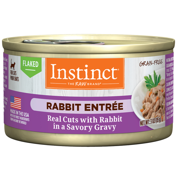 Instinct Rabbit Entrée Flaked Cat Food is made with flaked cuts of rabbit in a savory gravy, and with whole-food ingredients you can see, like carrots and spinach. Each ingredient is carefully chosen for their nutritional value and digestibility. Made in the USA, this food is made without grain, potato, corn, wheat, soy, carrageenan, gluten, artificial colors or preservatives.
