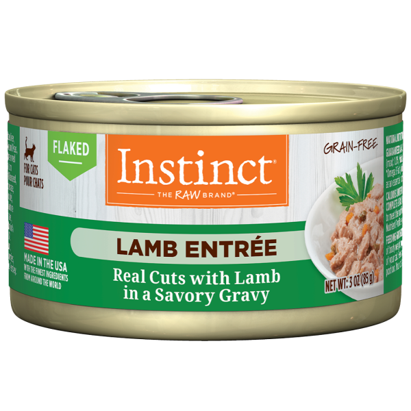 Instinct Lamb Entrée Flaked Cat Food is made with flaked cuts of lamb in a savory gravy, and with whole-food ingredients you can see, like carrots and spinach. Each ingredient is carefully chosen for their nutritional value and digestibility. Made in the USA, this food is made without grain, potato, corn, wheat, soy, carrageenan, gluten, artificial colors or preservatives.
