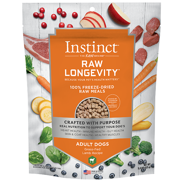 We want all pets to live longer, happier, healthier lives and that starts with the food they eat. Instinct Raw Longevity Adult Freeze-Dried Lamb Bites is made with 88% real lamb, organs, and bone & 12% vegetables, fruit & and other wholesome ingredients. The carefully selected rainbow of vegetables & fruits provide key nutrients your pet needs to stay healthy. Supporting heart, immune, gut, and skin & coat health, as well as healthy muscles. Because your pet deserves the best life possible - and it starts with the real nutrition of raw.