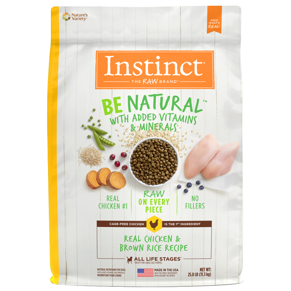 Natural nutrition begins here. Instinct Be Natural Real Chicken & Brown Rice Recipe starts with cage-free chicken and never contains filler, corn, wheat, soy or by-product meals or artificial preservatives and colors. Real animal proteins are the #1 and #2 ingredients followed by hearty whole grains. Each piece is tumbled with crushed freeze-dried raw chicken - raising the bar in nutrition and taste. Made in the USA with the finest ingredients from around the world, Instinct Be Natural provides natural nutrition with added vitamins and minerals.