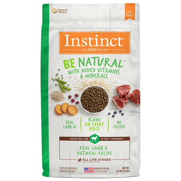 Natural nutrition begins here. Instinct Be Natural Real Lamb & Oatmeal Recipe starts with grass-fed lamb and never contains filler, corn, wheat, soy or by-product meals or artificial preservatives and colors. Real animal proteins are the #1 and #2 ingredients followed by hearty whole grains. Each piece is tumbled with crushed freeze-dried raw lamb - raising the bar in nutrition and taste. Made in the USA with the finest ingredients from around the world, Instinct Be Natural provides natural nutrition with added vitamins and minerals.