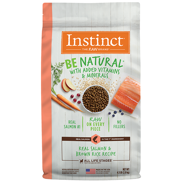 Natural nutrition begins here. Instinct Be Natural Real Salmon & Brown Rice Recipe starts with wild-caught salmon and never contains filler, corn, wheat, soy or by-product meals or artificial preservatives and colors. Real animal proteins are the #1 and #2 ingredients followed by hearty whole grains. Each piece is tumbled with freeze-dried raw fish - raising the bar in nutrition and taste. Made in the USA with the finest ingredients from around the world, Instinct Be Natural provides natural nutrition with added vitamins and minerals.