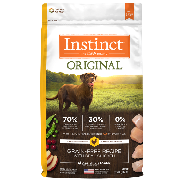 Instinct Original Grain-Free Recipe with Real Chicken unlocks your dog's potential to thrive. With cage-free chicken as the first ingredient, it's packed with animal protein for strong, lean muscles. Guaranteed levels of live, natural probiotics, natural Omegas and antioxidants support digestive health, healthy skin & coat and immune health. The only kibble with the pure, real nutrition of raw on every piece, it contains no grain, potato, corn, wheat, soy, by-product meal, artificial colors or preservatives.