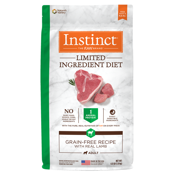 When your dog has food sensitivities, knowing exactly what's in their food is important. Instinct LID Grain Free Recipe with Real Lamb is made with one animal protein and one vegetable. Grass-fed lamb is a nutrient rich, easily digestible protein that provides all the essential amino acids. Natural Omegas and antioxidants support healthy skin & coat and immune system. With pure, real raw nutrition on every piece, Instinct LID Grain Free contains no grain, dairy, eggs, chicken, beef, fish, sweet potato, potato, chickpeas, corn, wheat, soy, artificial colors or preservatives.