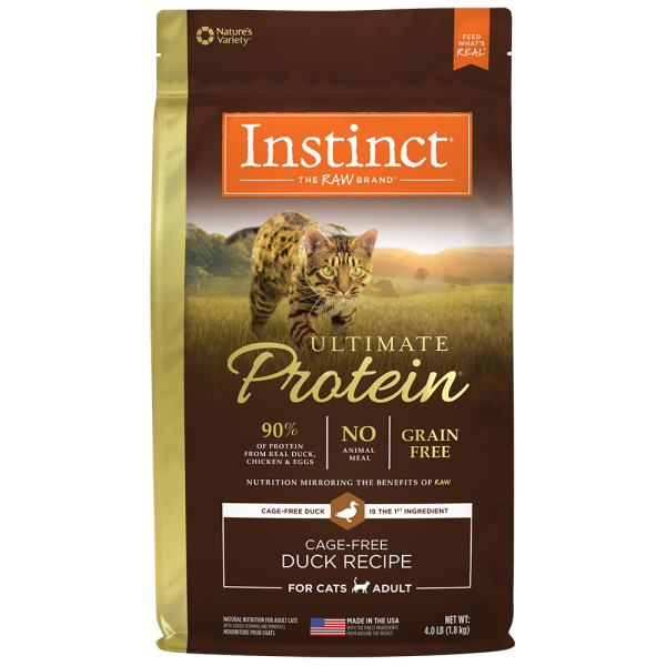 Instinct Ultimate Protein Grain-Free Cage-Free Duck formula for cats is crafted to closely mirror the benefits of Instinct's raw diets. The result is a kibble with the highest levels of protein from real meat & unmatched digestibility for optimal nutrient absorption. 90% of the protein is from real duck, chicken & eggs. Live, natural probiotics, natural Omegas & antioxidants support digestive health, healthy skin & coat and immune health. With the pure, real nutrition of raw on every piece, it's made without grain, potato, corn, wheat, soy, by-product meal, artificial colors or preservatives.