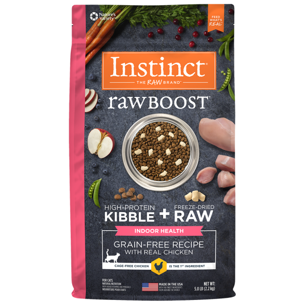 With high animal protein, grain-free, boosted nutrition with bites of freeze-dried raw meat, Instinct Raw Boost Grain-Free Recipe with Real Chicken for Indoor Health is a better way to feed kibble. Unlock your cat's potential to thrive. With cage-free chicken as the 1st ingredient it's packed with animal protein for strong, lean muscles. With highly digestible protein plus prebiotics for stool odor control, it has fewer calories for a less, active indoor lifestyle. It contains no grain, potato, corn, wheat, soy, by-product meal, artificial colors or preservatives.