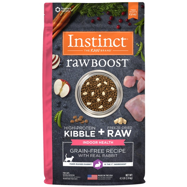 With high animal protein, grain-free, boosted nutrition with bites of freeze-dried raw meat, Instinct Raw Boost Grain-Free Recipe with Real Rabbit for Indoor Health is a better way to feed kibble. Unlock your cat's potential to thrive. With farm-raised rabbit as the 1st ingredient it's packed with animal protein for strong, lean muscles. With highly digestible protein plus prebiotics for stool odor control, it has fewer calories for a less, active indoor lifestyle. It contains no grain, potato, corn, wheat, soy, by-product meal, artificial colors or preservatives.