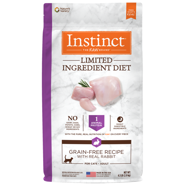 When your cat has food sensitivities, knowing exactly what's in their food is important. Instinct LID Grain Free Recipe with Real Rabbit is made with one animal protein and one vegetable. Farm-raised rabbit is a nutrient rich, easily digestible protein that provides all the essential amino acids. Natural Omegas and antioxidants support healthy skin & coat and immune system. With pure, real raw nutrition on every piece, Instinct LID Grain Free contains no grain, dairy, eggs, chicken, beef, fish, sweet potato, potato, chickpeas, corn, wheat, soy, artificial colors or preservatives.