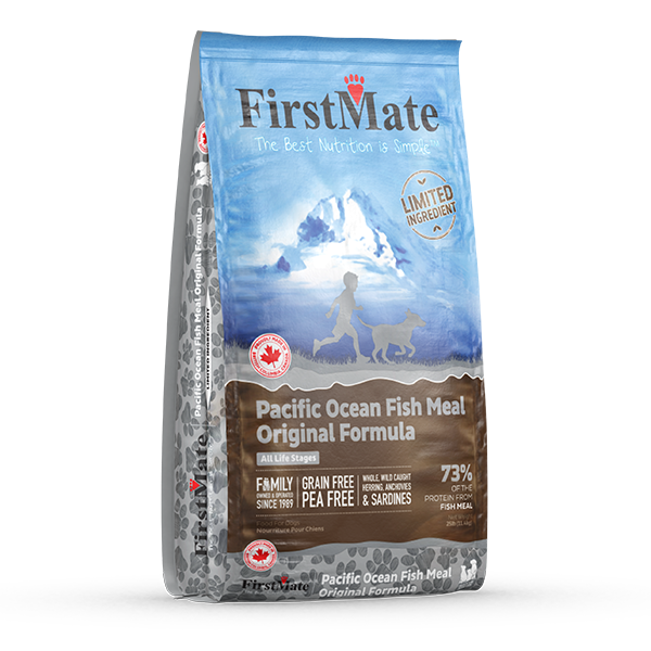 Canadian Brand. FirstMate's Pacific Ocean Fish Original uses a combination of wild caught herring, anchovies, and sardines. This limited ingredient diet is great for dogs with allergies and diet restrictions. Fewer ingredients make this formula easy on digestion. The chicken fat used in FirstMate Pet Foods is processed free of protein, eliminating the risk of allergies derived from chicken. This limited ingredient recipe is grain and pea free.