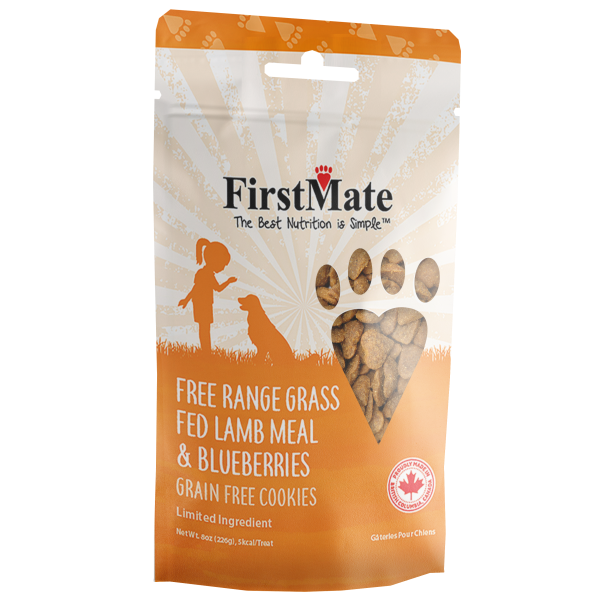 Canadian Brand. FirstMate's Limited Ingredient Free Range, Grass Fed Lam & Blueberries Treats are designed to be a meat-based alternative to a typical biscuit. They proudly use free range lamb, helping provide the best quality for your dog. This grain, glycerine, gluten, and pea free formula is ideal for everyday use as a treat or training aid for your dog.