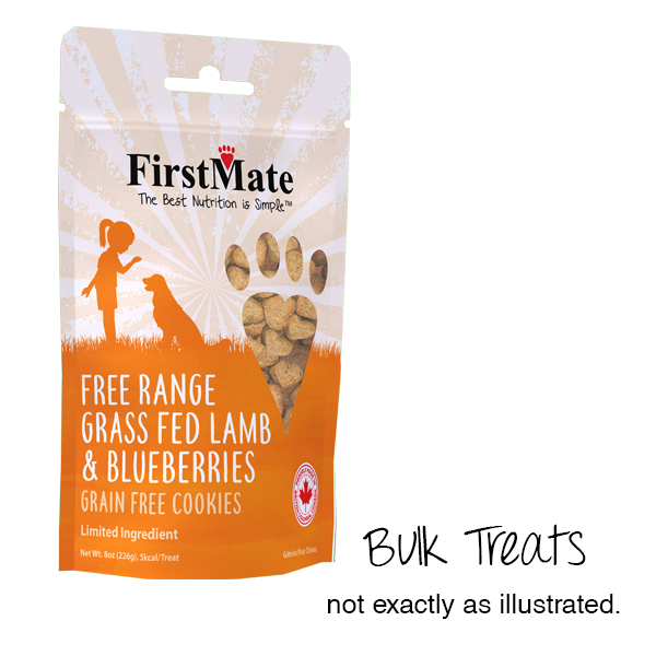 Canadian Brand. FirstMate's Limited Ingredient Free Range, Grass Fed Lamb & Blueberries Treats are designed to be a meat-based alternative to a typical biscuit. They proudly use free range lamb, helping provide the best quality for your dog. This grain, glycerine, gluten and pea free formula is ideal for everyday use as a treat or training aid for your dog.