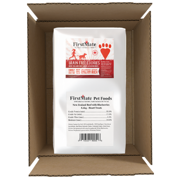 Canadian Brand. FirstMate's Limited Ingredient Beef & Blueberries Treats are designed to be a meat based alternative to a typical biscuit. They proudly use free range beef, helping provide the best quality for your dog. This grain, glycerine and pea free formula is ideal for everyday use as a treat or training aid for your dog.