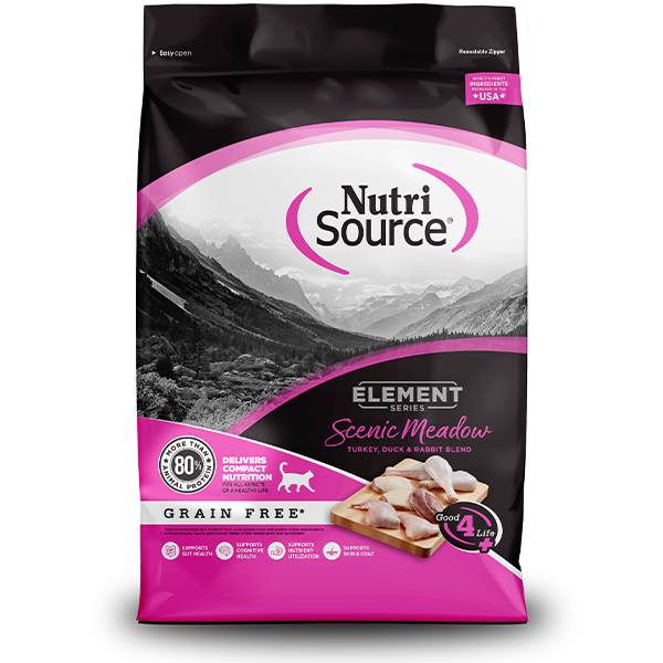 NutriSource Element Series Scenic Meadow Recipe Grain Free Cat Food. Nature's Intention, Perfected NutriSource Element Series offers an advanced diet for feline companions. Bringing together the best elements of nature's intention with cutting-edge nutritional concepts. Featuring recipes with animal ingredients providing more than 80% of the protein. It's all part of their mission to provide your pet with unsurpassed gut health and support whole-body health.