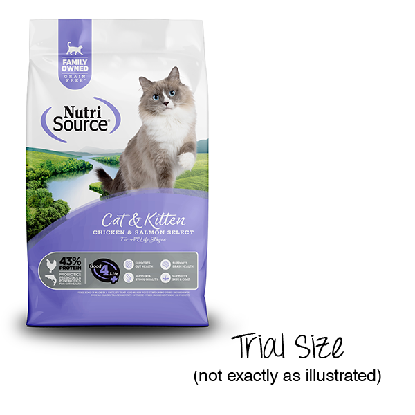 NutriSource Cat & Kitten Chicken & Salmon Select Food is a healthy grain free food formulated for both cats and kittens. Made with superfoods pumpkin, blueberry, and cranberry, it also includes a digestive enzyme blend to support digestion of proteins, fats, and carbohydrates. Balanced Omega-3 & Omega-6 fatty acids, naturally occurring L-Arginine, and supplemented with taurine, DL-methionine & choline chloride to support heart health and other important systems.