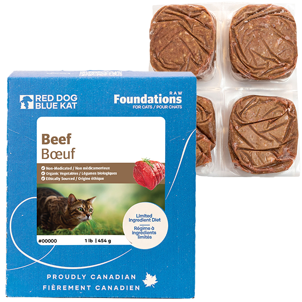 Canadian Brand. RDBK Beef Meals for cats are made from human grade beef raised humanely without hormones and antibiotics. These cat meals contain a small amount of organic vegetables, for antioxidants and fibre. It's a great meal if you are currently in the process of switching to raw. It's "udderly" good!