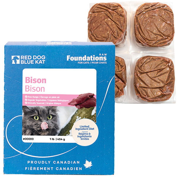 Canadian Brand. RDBK Bison and veggie meals for cats are made from human grade, non-medicated North American Buffalo (aka bison) meat, bison organs, and organic vegetables. No additives, preservatives or fillers. Bison is a perfect alternative for cats with food sensitivities and are unable to eat other red meats like beef and lamb. It's low fat content makes it suitable for animals who need to lose weight or have fat sensitivities.