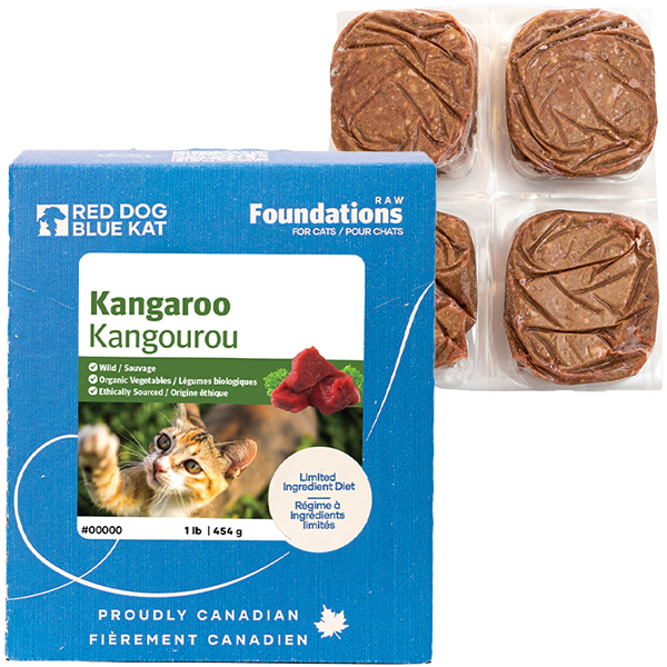 Canadian Brand. RDBK Kangaroo and Veggie meals for cats are made from wild Australian kangaroo meat, lamb organs and organic vegetables. The leanest and most exotic of all Red Dog Blue Kat meals, it is great for cats with allergies or food sensitivities and for cats that need to shed a few pounds. Your cat will be hopping around in no time!