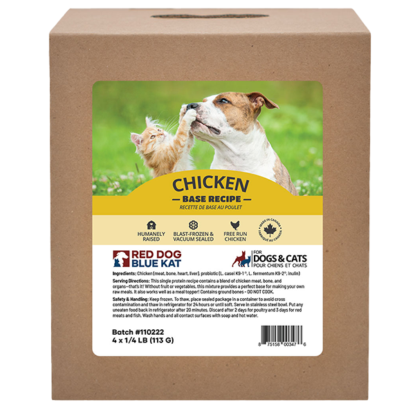 Canadian Brand. RDBK Chicken Base Recipe for dogs & cats provides a great meat base for making your own complete recipe. Because poultry bones are small and hollow, they can be ground down into the food. Bones are the number one source of calcium in the raw diet and it's essential to include bones in some form. Poultry ground with bone is great for pets of all life stages to ensure healthy bone growth and maintenance, nervous system health and much more.