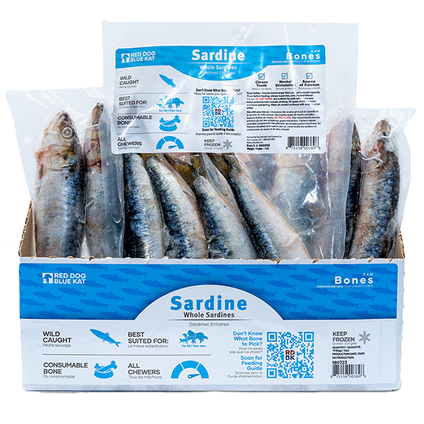 Canadian Brand. RDBK Whole Sardines are a great raw bone option for healthy pets to promote dental health and provide a rich source of dietary calcium and other essential minerals. These ethically sourced, human-grade, & wild-caught sardines are best suited for all chewing styles, including gentle chews, aggressive chewers, & gulpers. Whole Sardines include meat, connective tissues, joint cartilage, fat, bone and sometimes a small amount of marrow. Salmon Heads are recommended for dogs of all sizes. Raw bones should not be cooked, and pets should be supervised when feeding any bone.