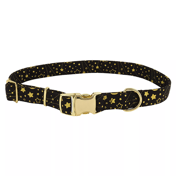 This beautiful dog collar from Coastal Pet Products is sure to turn heads! It's made with a dazzling metallic fabric that has a subtle sparkle, and features a gold colored, metal buckle for an extra touch of luxury. The collar is adjustable so you can find the perfect fit for your pup, and the strong construction ensures it will stand up to even the most active dogs. Whether you're looking for a special collar for a party or everyday use, the Accent Metallic Adjustable Dog Collar in 'Bright Black Galaxy' is sure to please.