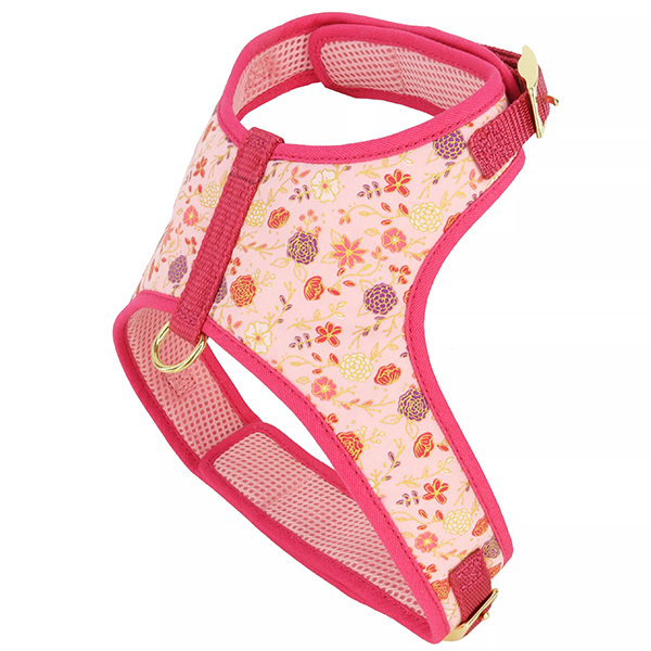 The Accent Metallic Adjustable Dog Harness in 'Delicate Pink Flowers' is a great product for dogs who love to sparkle and shine. This harness is made with a durable metallic fabric that will catch the light and make your dog look amazing. Plus, the harness has a mesh inner lining to keep your dog cool and comfortable. The metal tongue buckles allow for adjustment on both the neck and girth so you can get the perfect, comfortable fit for your dog. Our harnesses may be strong but they are not indestructible and should only be used when going on walks before being promptly taken off afterwards.