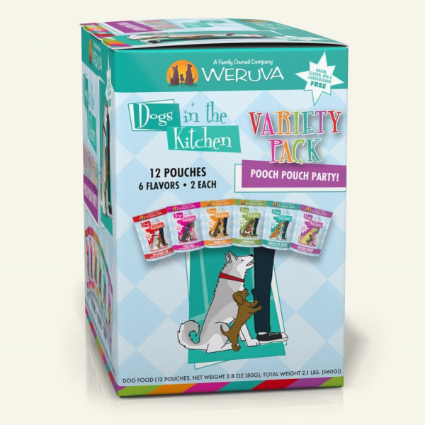 Weruva's Dogs in the Kitchen Pooch Pouch Party Variety Pack contains 12 pouches (2.8oz) - 2 each of six different flavors - The Double Dip, Fowl Ball, Goldie Lox, Lamburgini, Funk in the Trunk and Love Me Tender. Great for multi-dog households and picky pooches! Dogs in the Kitchen formulas focus on protein and moderate fat.