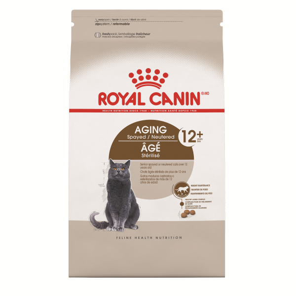 Canadian Brand. 30% of cats over 12 years of age are overweight. AGING SPAYED/NEUTERED 12+ is for spayed or neutered cats over 12 years of age. AGING SPAYED/NEUTERED 12+ helps maintain ideal weight and supports renal health. It provides 100% complete and balanced nutrition as it encourages healthy aging.