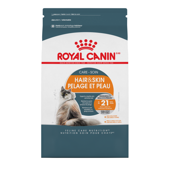 Canadian Brand. Dandruff, dull coat and skin irritation are signs of sensitive skin. The cat's coat is the "mirror" of their health, and deterioration in hair quality can be a sign of a nutritional deficiency. Proper nutrition can help nourish the skin and coat, reflecting true beauty and health. HAIR & SKIN CARE is for adult cats from 1 to 10 years old with sensitive skin and poor coat condition. HAIR & SKIN CARE fights free radicals and strengthens and protects skin. It provides 100% complete and balanced nutrition and promotes a healthy and glossy coat.