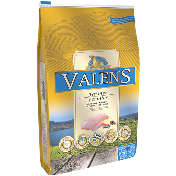 Canadian Brand. Valens Farmer for dogs is formulated to promote and maintain a healthy body weight for your pet. Capturing the essence of the farm with ingredients that include tender chicken and turkey, complemented with fresh tangy fruits and vegetables, this recipe is sure to appeal to your canine companion. Fresh deboned poultry meats are the first two ingredients and freeze-dried chicken is added for increased aroma, palatability and taste. Ingredients are free of hormones, antibiotics, by-products, or artificial preservatives and the recipe is hypoallergenic and free of corn, wheat and soy.