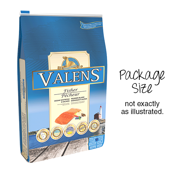 Canadian Brand. Valens Fisher for dogs is formulated to provide and promote total nutritional health for your canine companion. Taking its essential fresh meat protein sources from the ocean, this recipe combines fresh salmon, dover sole and Arrowtooth flounder in a nutritious blend that your dog will find irresistible. Fresh deboned fish are the first and primary ingredients and freeze-dried pacific cod is added for increased aroma, palatability and taste. Ingredients are free of hormones, antibiotics, by-products, or artificial preservatives and the recipe is hypoallergenic and free of corn, wheat and soy.
