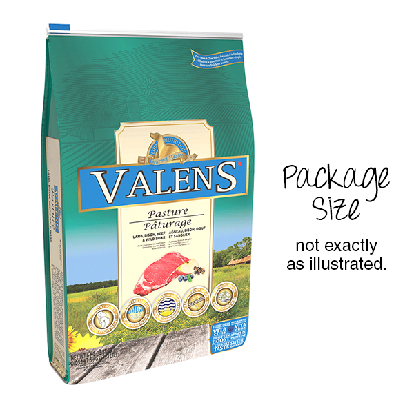 Canadian Brand. Valens Pasture for dogs is formulated for an active lifestyle and promotes & maintains muscular development. Finding its essence in the life the pasture affords, this recipe combines high quality succulent lamb with fresh beef, all-natural fresh bison & delicious wild boar as the first four ingredients to offer your K9 the savory delight of eating in the wild. Cubes of freeze-dried beef liver are added for increased aroma, palatability & taste. Ingredients are free of hormones, antibiotics, by-products, or artificial preservatives and the recipe is hypoallergenic and free of corn, wheat & soy.
