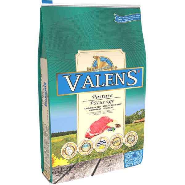 Canadian Brand. Valens Pasture for dogs is formulated for an active lifestyle and promotes & maintains muscular development. Finding its essence in the life the pasture affords, this recipe combines high quality succulent lamb with fresh beef, all-natural fresh bison & delicious wild boar as the first four ingredients to offer your K9 the savory delight of eating in the wild. Cubes of freeze-dried beef liver are added for increased aroma, palatability & taste. Ingredients are free of hormones, antibiotics, by-products, or artificial preservatives and the recipe is hypoallergenic and free of corn, wheat & soy.