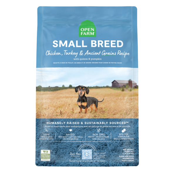 Open Farm Grain-Free Small Breed Ancient Grains Dry Dog Food has added New Zealand Green Lipped Mussel for healthy hip & joint support. Formulated specifically for smaller breeds with higher metabolic rates, this bite sized recipe features a combination of humanely raised chicken, turkey and ancient grains blend, that's free of peas, potato, and legumes. Open Farm uses high-quality meats raised without antibiotics or added hormones. Made with antioxidants and Vitamin A to support healthy vision, naturally occurring prebiotic fibers like pumpkin and dried chicory root support healthy digestion.