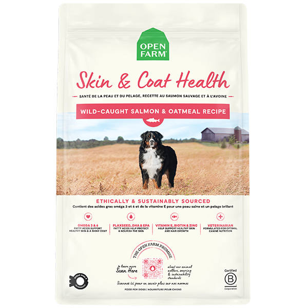 Open Farm Wild-Caught Salmon & Oatmeal Skin & Coat Health dog food is a vet-formulated kibble. It is a complete and balanced meal high in omega fatty acids to support healthy skin and a shiny coat. Crafted with high quality Ocean Wise recommended wild-caught salmon as the #1 ingredient, combined with salmon oil and vitamin E to help nourish the skin and support a shiny, glossy coat. Rich in flaxseed, biotin, & zinc to support healthy skin and hair growth.