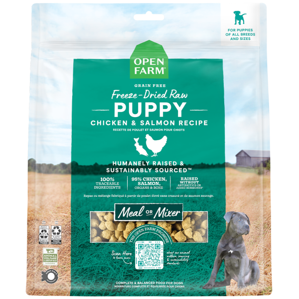 Open Farm Chicken & Salmon Freeze-Dried Raw Puppy food focused recipe features G.A.P certified, humanely raised chicken and chicken organs with no antibiotics or added hormones. In addition, Ocean Wise recommended salmon and organic, non-GMO fruits and vegetables are added to provide a highly nutritious complete and balanced meal your pup will crave.