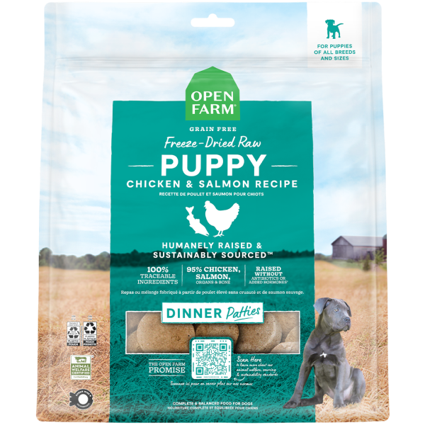 Open Farm Chicken & Salmon Freeze-Dried Raw Puppy food focused recipe features G.A.P certified, humanely raised chicken and chicken organs with no antibiotics or added hormones. In addition, Ocean Wise recommended salmon and organic, non-GMO fruits and vegetables are added to provide a highly nutritious complete and balanced meal your pup will crave.